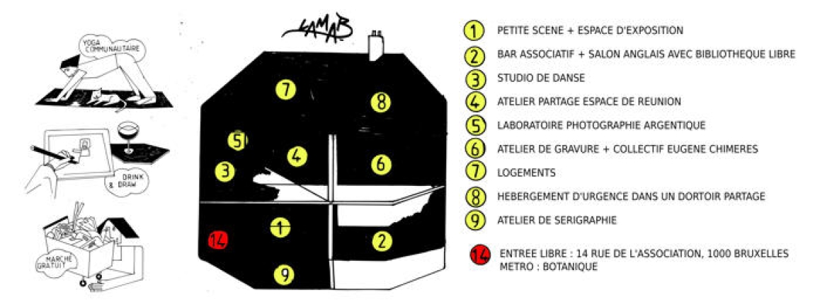 "Nous avons créé l’ASBL : « La Maison A Bruxelles » (LAMAB) en 2015, dans la lignée des alternatives en matière d’habitat, d’espace de travail et de lieux de rencontres et de partages.